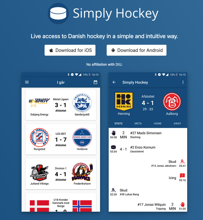 Følg kampenes forløb samt spil statistik live i appen Simply Hockey (fra U14 og opefter)
